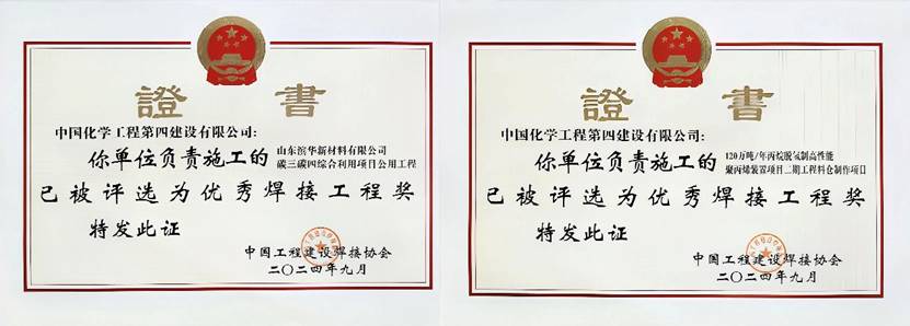 近日,從中國工程建設焊接協(xié)會傳來喜報,由公司申報的江西公司“山東濱華新材料有限公司碳三碳四綜合利用項目公用工程”和華北公司“120萬噸/年丙烷脫氫制高性能聚丙烯裝置項目二期工程料倉制作項目”分別榮獲2024年度優(yōu)秀焊接工程獎。