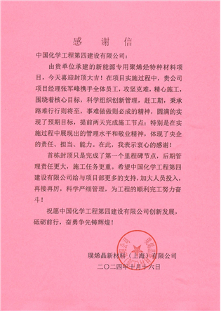 近日,璞烯晶新材料(上海)有限公司向華東公司發(fā)來感謝信,對項目團(tuán)隊在璞烯晶新能源專用聚烯烴特種材料項目節(jié)點(diǎn)攻堅的突出表現(xiàn)予以高度贊揚(yáng)和衷心感謝。